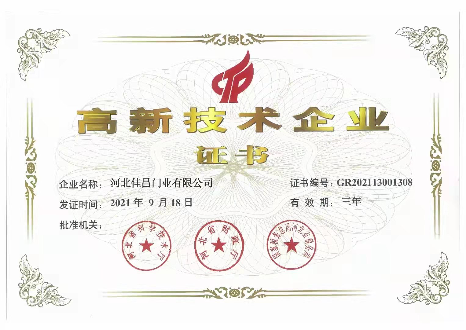 高新技术企业证书